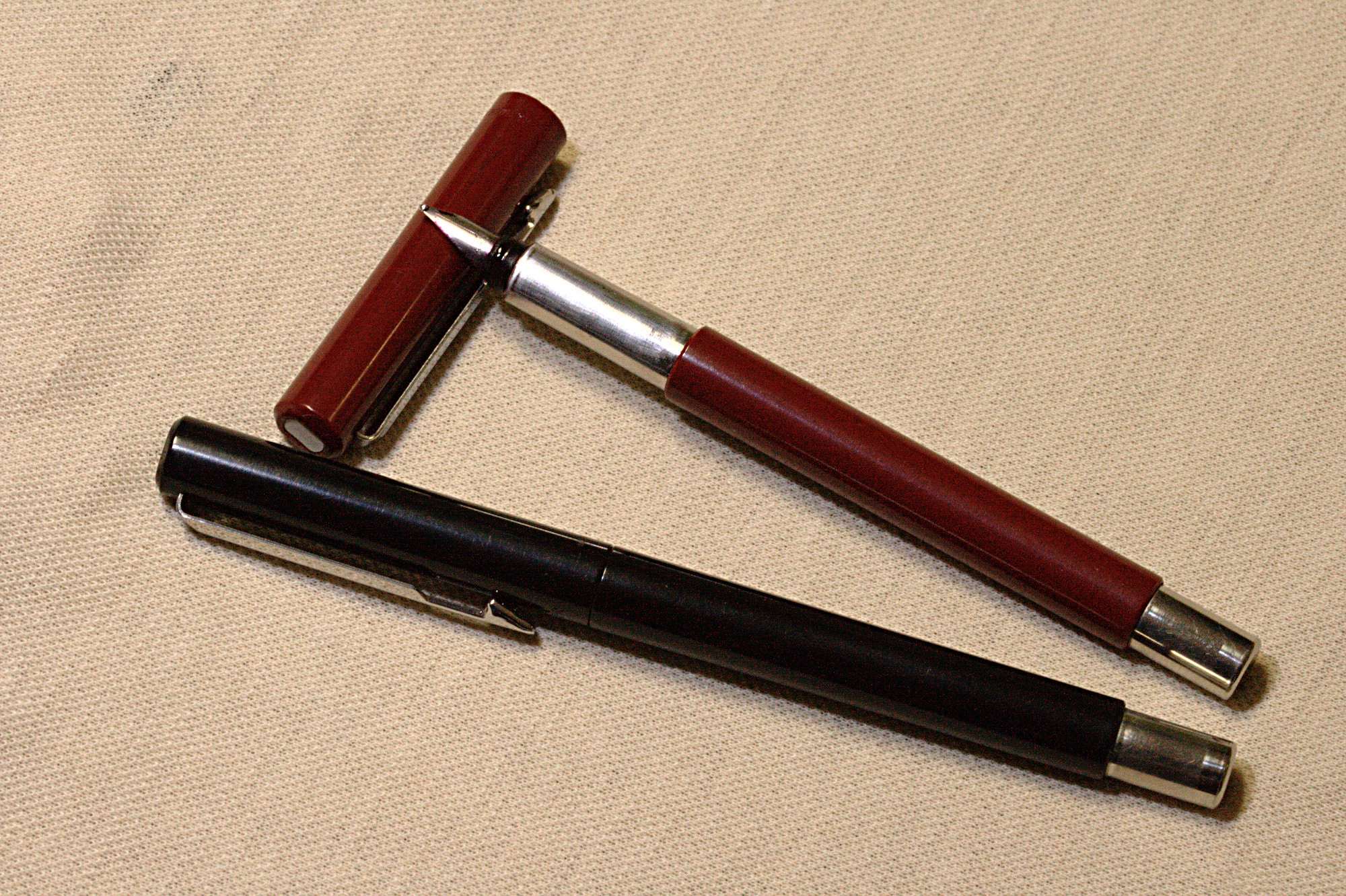 They still get used regularly and the black one is inked with a regular blue while the red one is fittingly inked with red. The nibs are medium but are still not too heavy. They are fitted with converters. Amazingly the red one is an original but the black one has been replaced. The converters are still available and I have a spare.